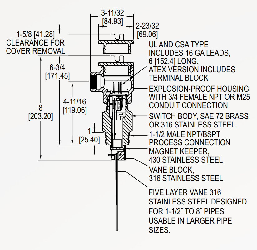 | Jenis sakelar | Standar sakelar jepret SPDT, sakelar jepret DPDT opsional | Koneksi proses | 1-1/2˝ NPT jantan atau 1-1/2˝ BSPT jantan |