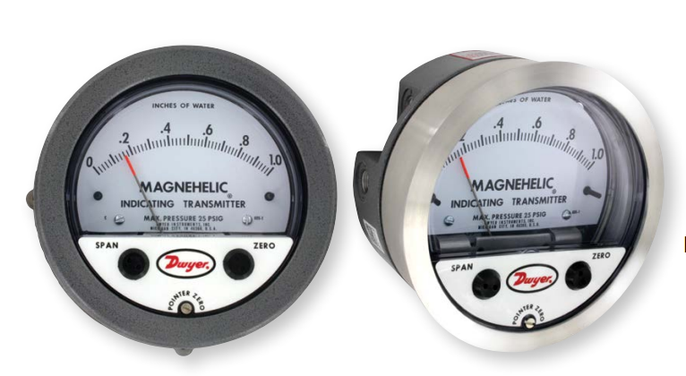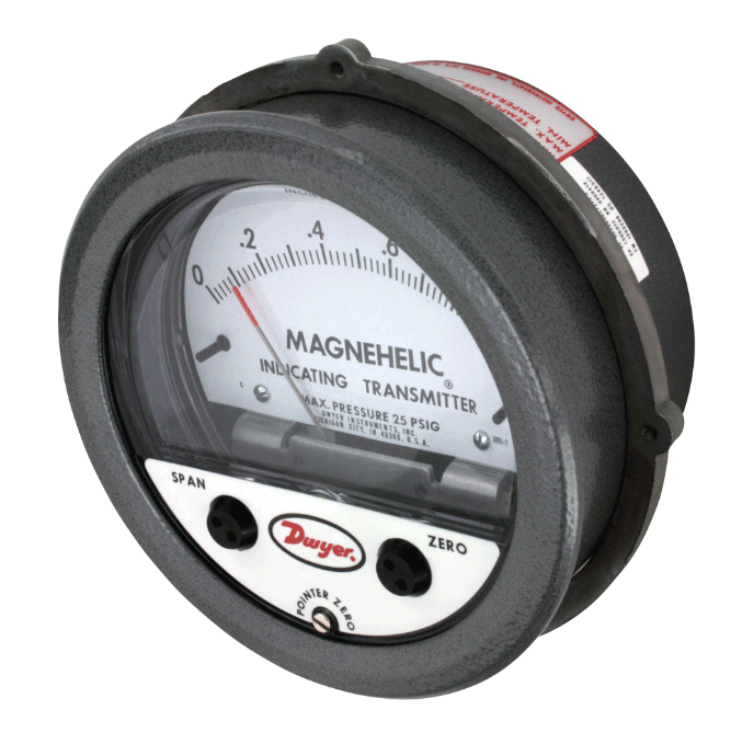 The Series 605 Magnehelic® Differential Pressure Indicating Transmitter provides for both visual monitoring and electronic control of very low differential pressure. The Series 605 is ideal for control applications in building HVAC systems where local indication is desired during routine maintenance checks or necessary when trouble shooting the system. The easily read dial gage is complimented by the 2-wire, 4-20 mA control signal utilizing the time-proven Dwyer® Magnehelic® gage mechanical design and Series 600 transmitter technology. The 2-wire design with terminal strip on the rear simplifies connection in any 4-20 mA control loop powered by a 10-35 VDC supply.