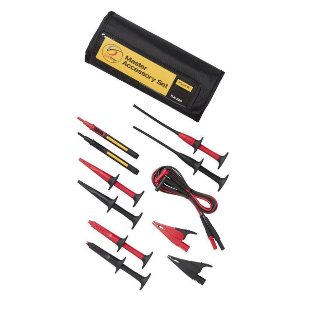 Test leads are an integral part of the complete measurement system. Worn out test leads can cause inaccurate readings and pose serious shock or electrocution hazard. The Fluke TLK-225 SureGrip™ Master Accessory Set with 13 items is the perfect replacement kit that provides flexibility and comfort with all SureGrip™ leads and probes in a convenient six pocket, roll up pouch.